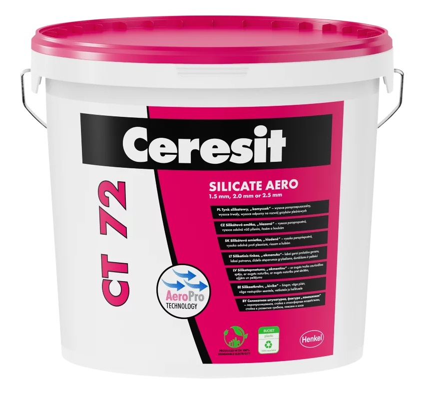 Ceresit CT 72 je silikátová tenkovrstvová dekoratívna omietka so štruktúrou „hladená“ a zrnitostou 1,5 alebo 2,5 mm, určená na vonkajšie aj vnútorné použitie. Vyniká svojou vysokou paropriepustnosťou a hydrofóbnymi vlastnosťami, vďaka čomu je ideálnou voľbou pre fasády, kde je žiaduce, aby steny mohli prirodzene dýchať. Omietka je odolná voči poveternostným vplyvom, mechanickému poškodeniu aj čisteniu, čo jej zaručuje dlhú životnosť a stály vzhľad.