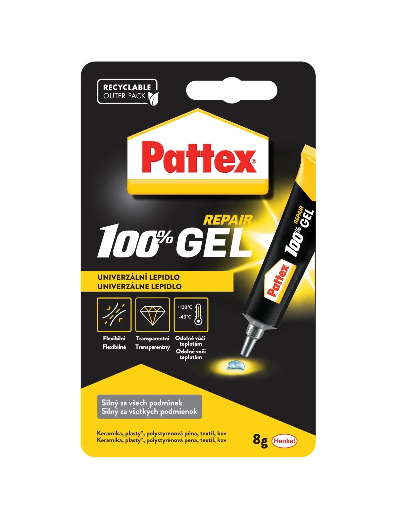 Pattex 100% je vhodný na kutilské, modelárske a opravárenské práce v interiéri aj exteriéri, na tvorbu dekoratívnych predmetov s priehľadnou povrchovou úpravou a pod. Vhodný na lepenie alebo povrchovú úpravu savých i nesavých materiálov, ako sú hliník, betón, oceľ, nerezová oceľ, obklady a dlažba, sklo, keramika, drevo, korok, meď, mosadz, povrchovo upravené materiály, skleným vláknom vystužený polyester (GFP), koža, plátno, papier, kartón, tvrdené PVC, polykarbonát, penový polystyrén, kameň, zinok, zrkadlá. V prípade neželezných kovov, ako sú meď, mosadz alebo bronz, v prípade povrchovo upravených materiálov (farby, laky a pod.) alebo plastov odporúčame vykonať najskôr test kompatibility lepidla s daným povrchom.