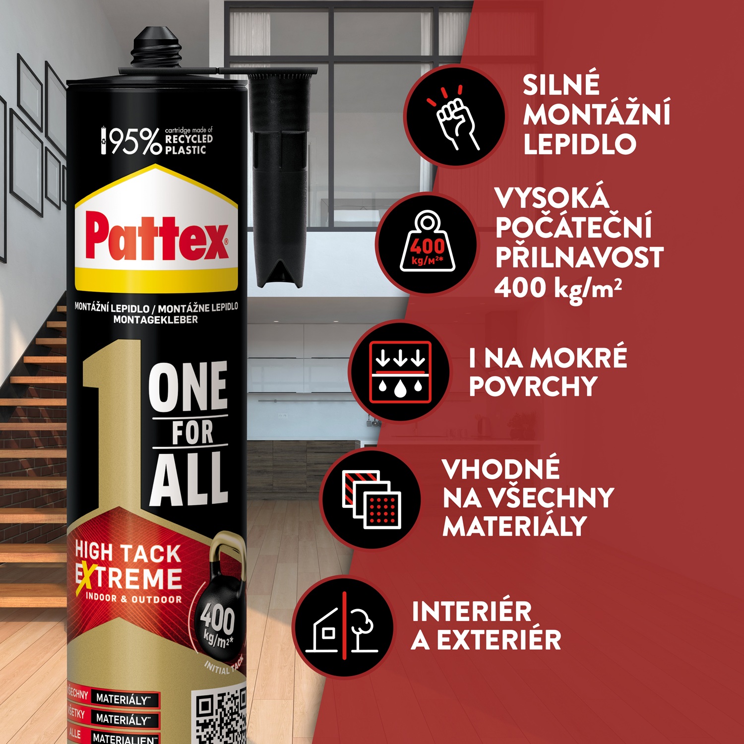 Pattex ONE FOR ALL Instant Tack je jednozložkové montážne lepidlo určené pre interiér aj exteriér, ktoré vďaka technológii FlexTec® dosahuje počiatočnú pevnosť až 400 kg/m². Je ideálne na pevné spojenie bez potreby mechanického upevnenia. Nesteká, neprepadáva sa a spoj je možné niekoľko minút upravovať. Po vytvrdnutí je pretierateľné, brúsiteľné a vyplní drobné praskliny. Tlmí vibrácie aj hluk.