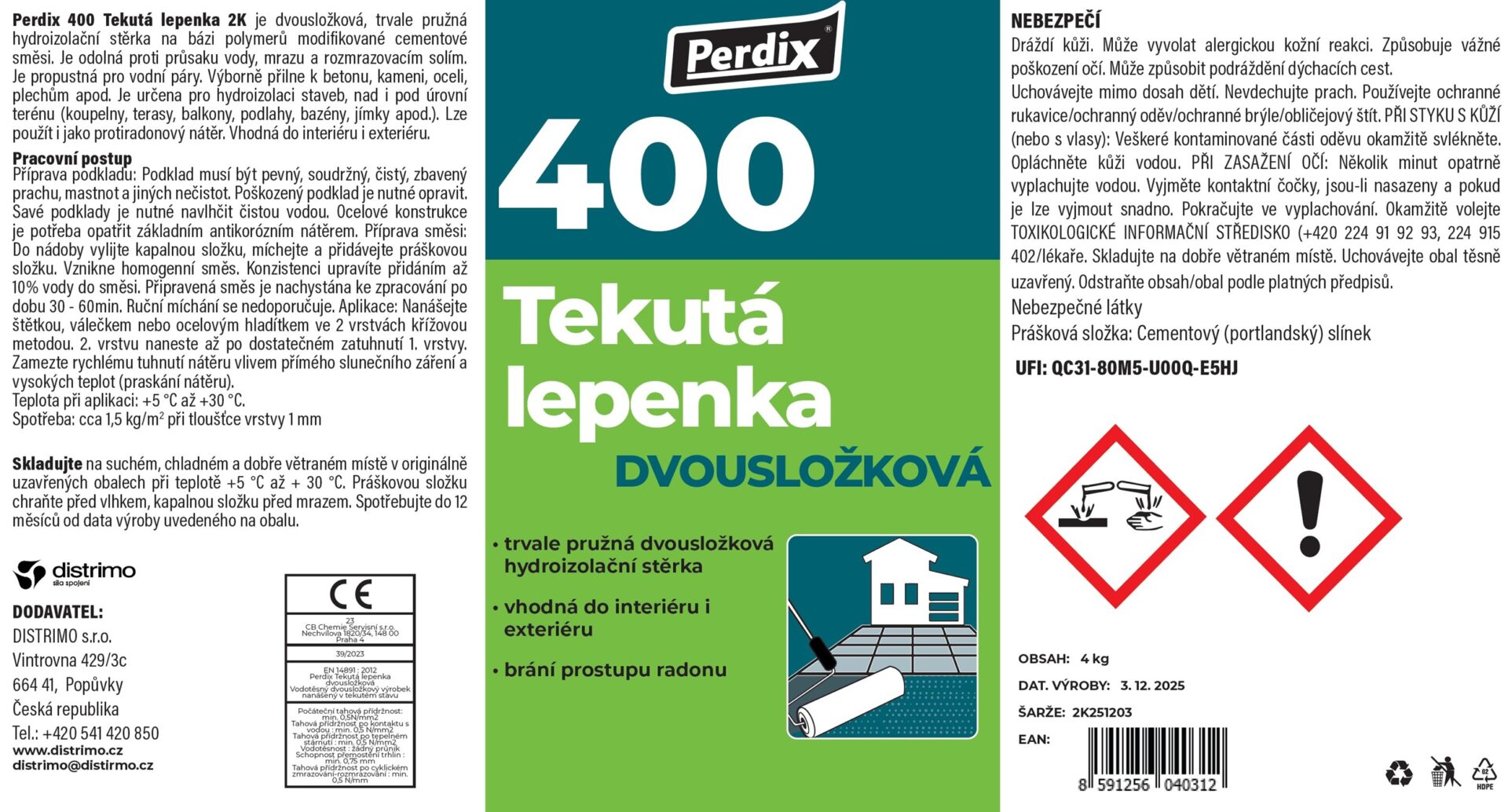 Perdix Tekutá lepenka 2K je dvojzložková pružná hydroizolačná hmota, ktorá po zmiešaní kvapalnej a sypkej časti vytvorí plastickú, tixotropnú a veľmi jednoducho aplikovateľnú zmes. Po vytvrdnutí vzniká spoľahlivá hydroizolačná membrána, ktorá bráni presakovaniu vody pod hydrostatickým tlakom a zároveň neprepúšťa vlhkosť. Hmota je dostupná v sivej farbe a vďaka mikropórovitej štruktúre umožňuje prestup vodných pár bez podpory kondenzácie.