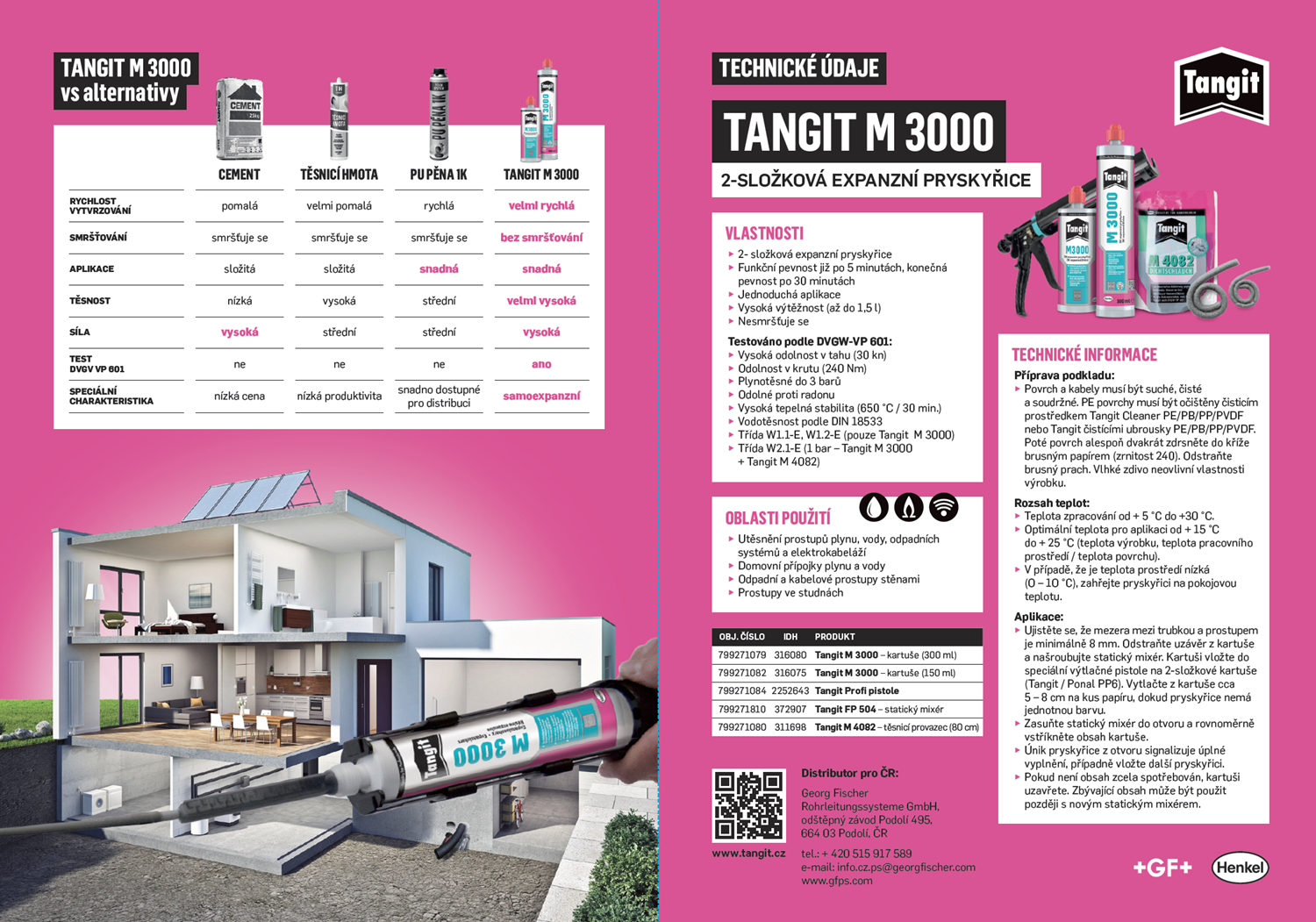 Tangit M 3000 je dvojzložková expanzná živica navrhnutá pre spoľahlivé utesnenie stavebných prierazov a prestupov. Vďaka okamžitému napeneniu zväčší svoj objem až 5x, čím rýchlo a efektívne vyplní aj ťažko prístupné medzery. Po aplikácii dosiahne funkčnú pevnosť už za 5 minút, zatiaľ čo konečnú pevnosť dosahuje počas 30 minút. Po vytvrdnutí si zachováva svoj objem a štruktúru, čo zaisťuje dlhodobú stabilitu a spoľahlivosť.